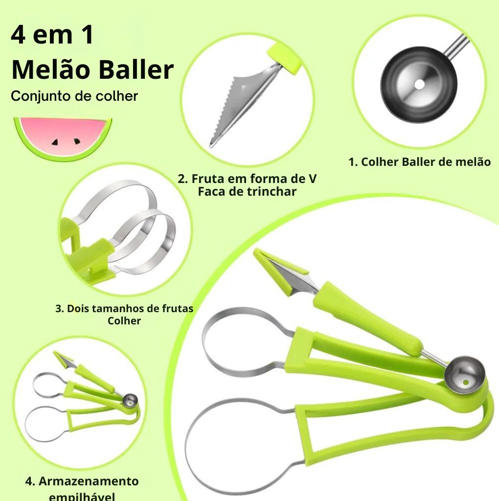 O conjunto de colher de frutas inclui bolas de escavação de melão, uma faca de corte de frutas em forma de V, uma colher bidimensional para fatiar frutas e separar a polpa de frutas. Utensílios de cozinha necessários.